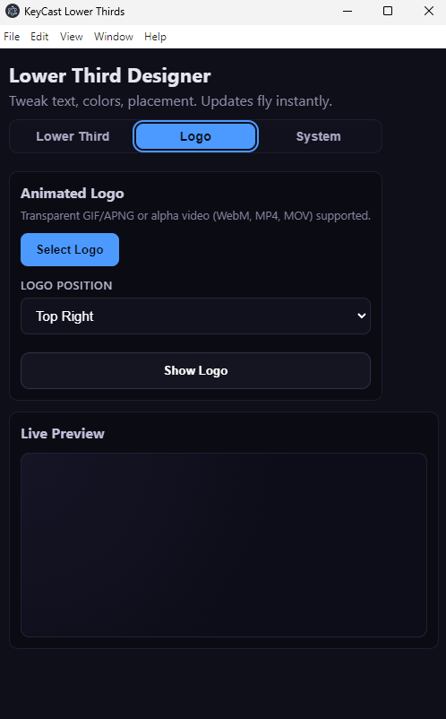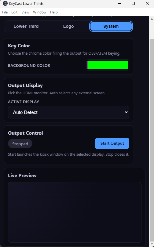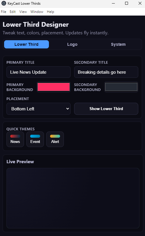 To learn the craft, I built KeyCast Lower Thirds, an Electron + React app that mimics broadcast workflows without the usual control-room headaches. You get a clean operator panel, a fullscreen kiosk output, and real-time sync between the two. Toggle text, colors, placements, and animated logos instantly, then ship the feed straight into OBS or an ATEM via chroma key or alpha workflows.